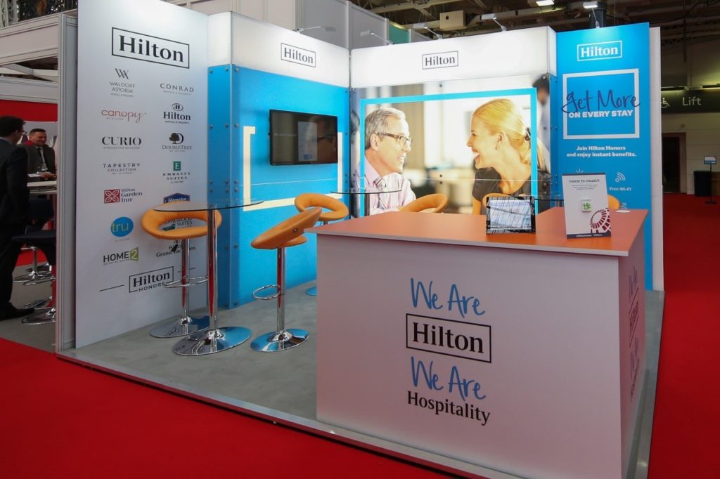 So a second has already gone by and you need to explain yourself… quickly! Another common mistake we seem time and time again is too much wording – or even abstract messaging – on the stand. First of all, think back to the 3 second rule of capturing attention at a trade show – you only have 3 seconds. So don’t fill your lovely graphics with lots of blurb that people simply won’t read. Instead, be punchy and be obvious. In one sentence, simply describe what you do. We love this example of a stand we did for Hilton, which simply says ‘We are Hilton. We are Hospitality”